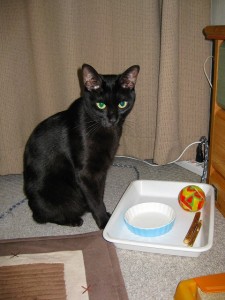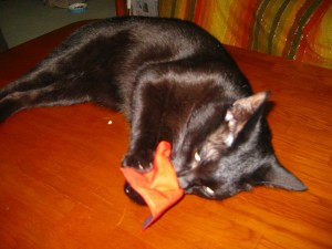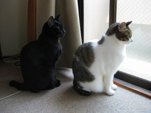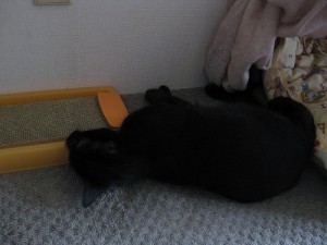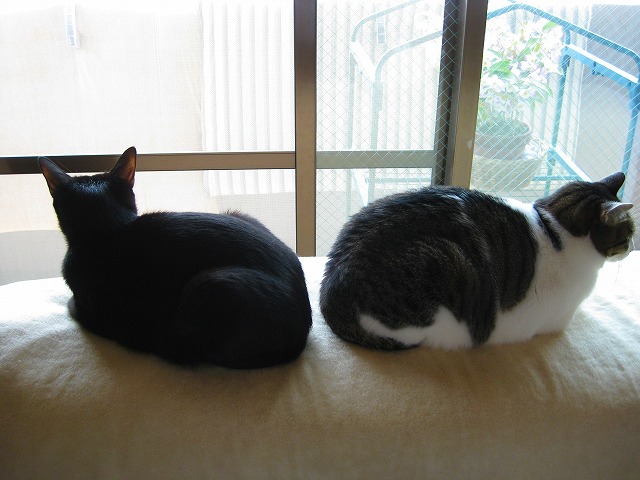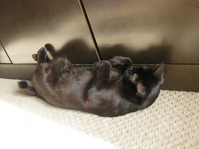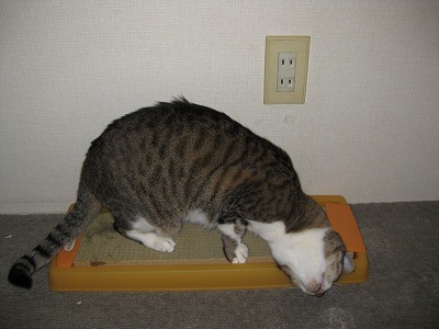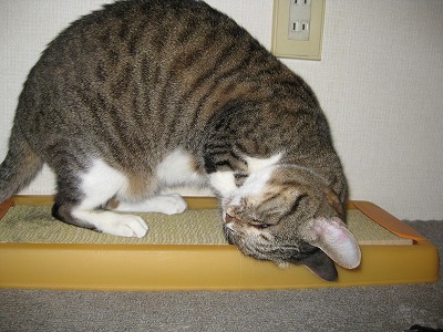 ねらってる、その2。 爪とぎを新しく出してあげました。 ついでにまたたびも振ってあげたところ・・・、 ネネ、大満足。「たまらないニャ~。」 それをねらう子がいます・・・。 「じーーーっ。」 たまらず体すりすりアタック!!