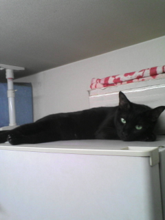 ブブ、冷蔵庫の上(お気に入り)で昼寝。 寝ててもすぐカメラ目線です。