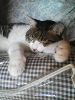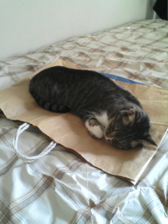 最近、紙袋の上で寝てる。ちょっと朝晩は寒くなって来たのかな?